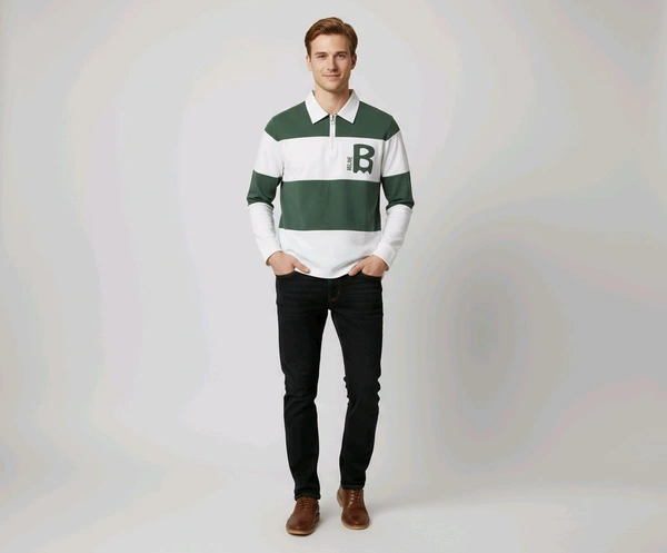 Design: Wide horizontal stripes, zip-up collar, and graphic chest designColor: Green & WhiteCondition: Brand new ,Ideal for: Everyday wear, semi-formal events, and pairing with jeans or chinos. Care: Machine washable, holds shape and color after each wash. Message now to grab this cool and comfortable polo shirt—perfect addition for any stylish man’s closet!